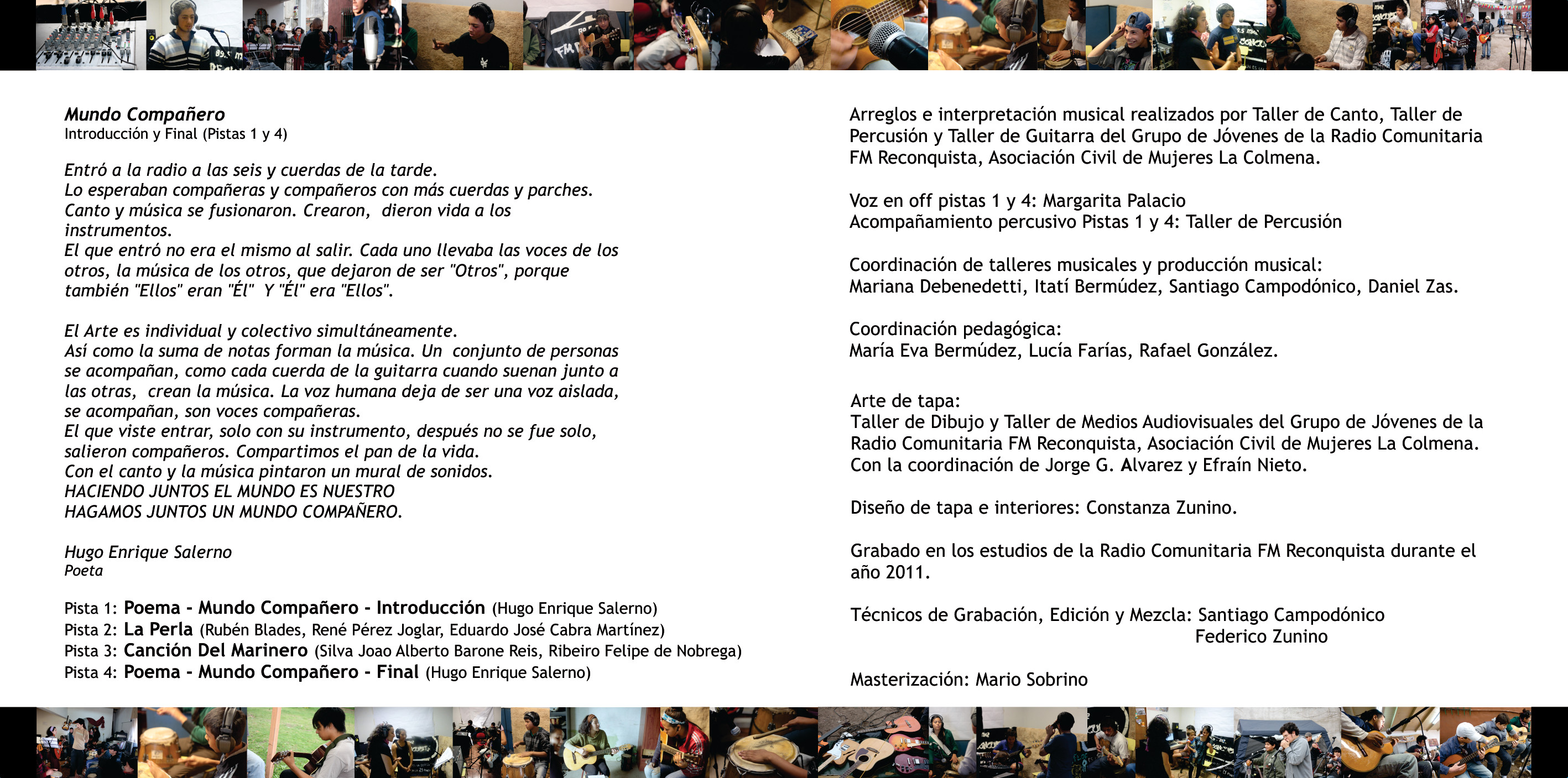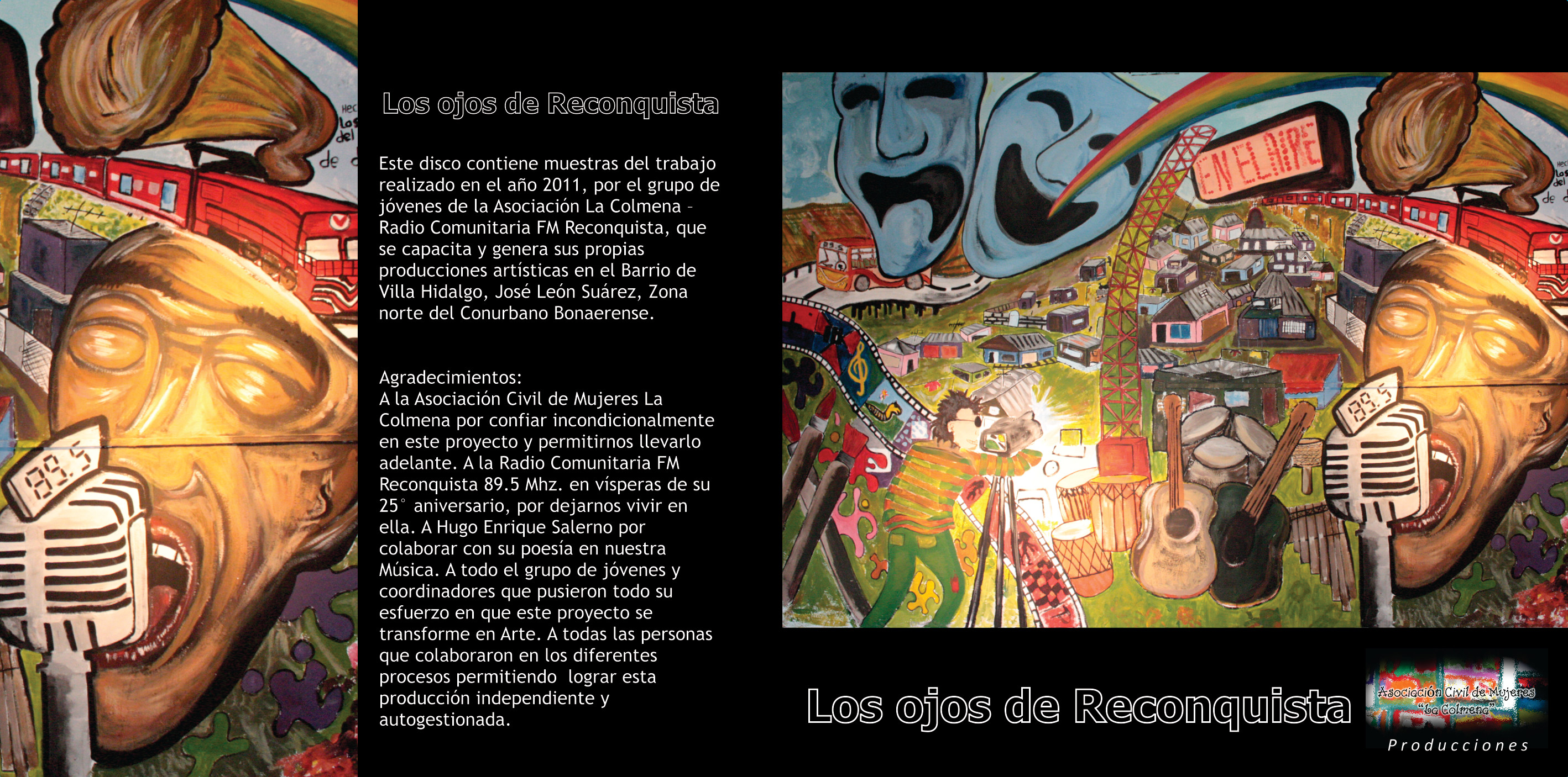 Finalmente hacemos la publicación oficial de este trabajo musical realizado íntegramente por el grupo de jóvenes de la Asociación Civil de Mujeres La Colmena y Radio Comunitaria FM Reconquista 89.5 Mhz. en el ciclo 2011. Dejando un registro concreto de esta construcción colectiva que va generando año a año nuevas experiencias y nos permite proponernos nuevos desafíos en torno a la producción de obras artístico-culturales desde la concepción comunitaria. Nuevamente Felicitar a todo el equipo que llevó adelante esta hermosa experiencia, y el agradecimiento a tod@s l@s que colaboraron para concretar todas las producciones del proyecto «Los Ojos de Reconquista».