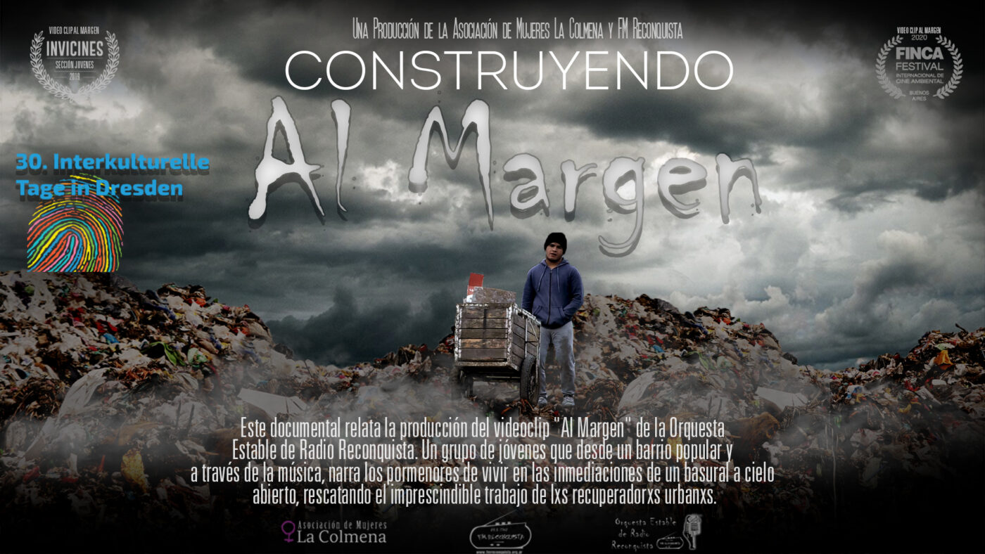 Villa Hidalgo es un barrio popular, de infraestructura precaria, ubicado en la cuenca del Río Reconquista. Allí focaliza su trabajo La Asociación de Mujeres La Colmena, la cual registra antecedentes de acciones comunitarias desde principios de los años ’80, y tiene el objetivo de promover estrategias de inclusión educativa, política, cultural, económica y social para las mujeres del barrio y sus familias. En el 2018 se realiza el rodaje de los videoclips de “Al margen” (Nicolás Aulet) y “Orillas de andén” (Graciela Pesce) de la mano de la productora Conurbana Audiovisual y con el apoyo del Instituto Nacional de la Música (INAMU). En el videoclip “Al margen”, filmado en el espacio de la Cooperativa Bella Flor, ubicado en la CEAMSE, se busca plasmar el mismo concepto que propone la canción; retratando el cotidiano del barrio de Villa Hidalgo y rescatando el imprescindible trabajo de lxs recuperadorxs urbanxs.
